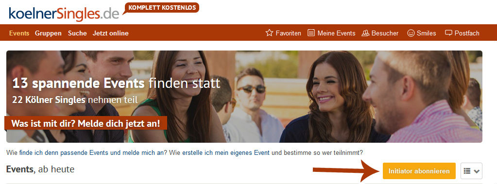 Probier diese hilfreiche Funktion doch einfach mal aus und wirf gleich mal einen Blick in den prall-gefüllten Eventkalender der Kölner Singles und erlebe tolle Momente mit anderen KöSis ;)