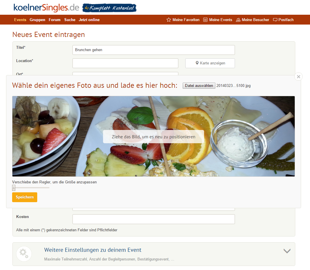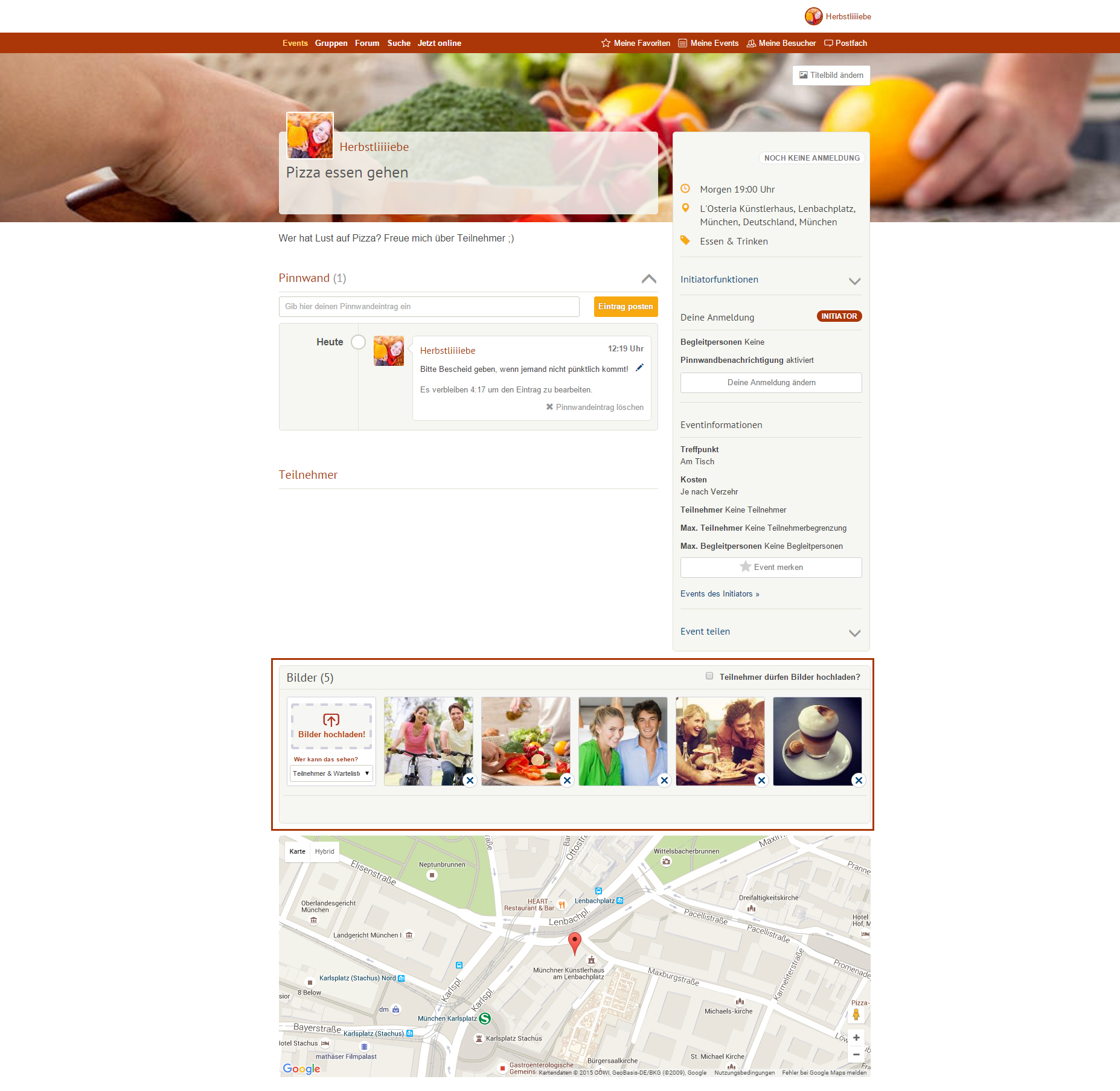 Bei den Events haben wir den Fokus auf Bilder gelegt, denn nicht nur beim Profil ist ein Bild besonders wichtig. Ein Bild zeigt Stimmung, Emotionen und sogar Gefühle, und vermittelt so einen ganz bestimmten Eindruck auf einen Blick, ohne dass dafür ein langer Text notwendig wäre. Deshalb haben die Initiatoren der Events neben eine Reihe von vorgegebenen Bildern die Möglichkeit erhalten, ihre eigenen Bilder als Event-Titelbilder hochzuladen.